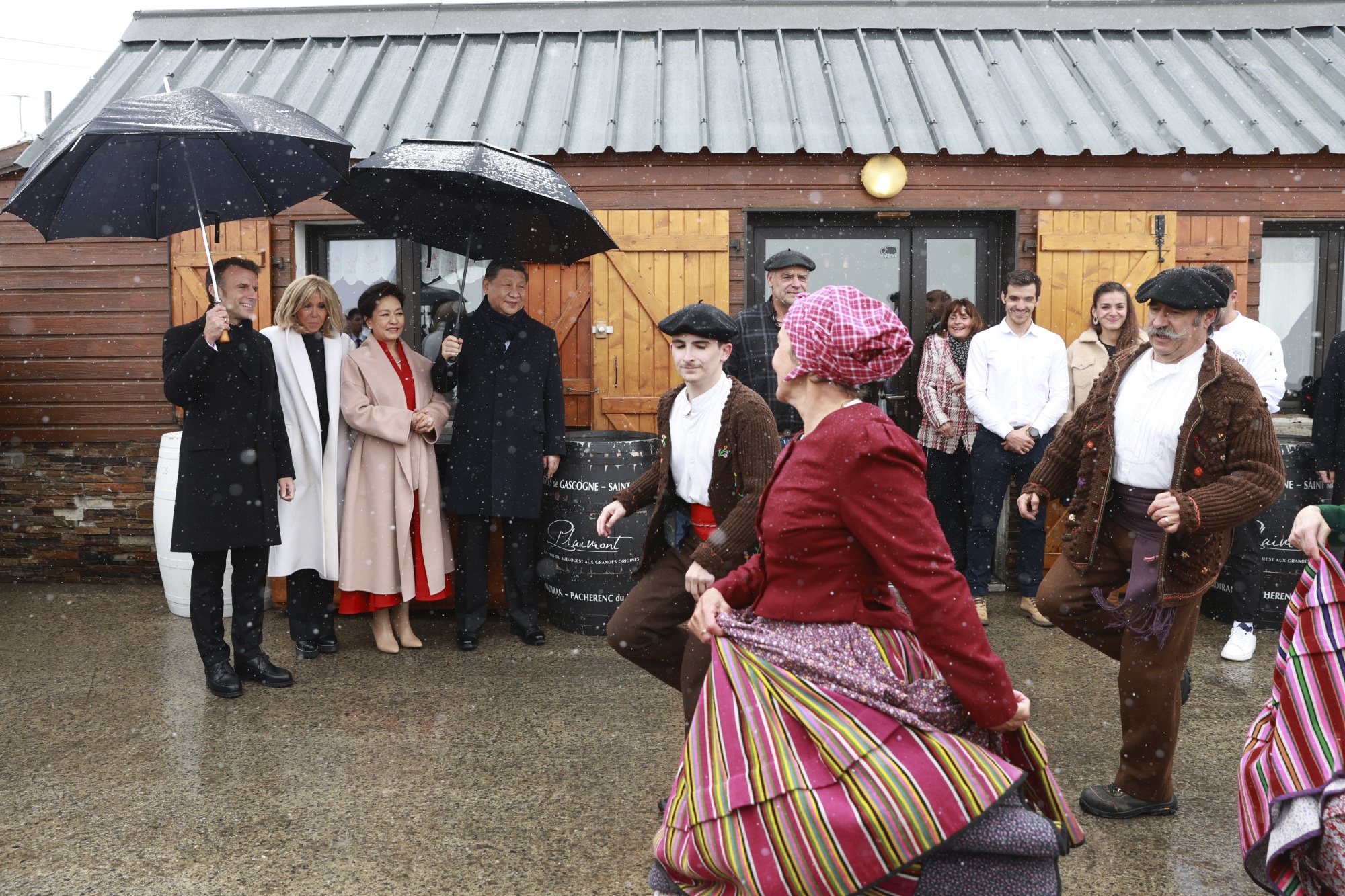 埃马纽埃尔·马克龙和习近平在法国比利牛斯的图尔马莱山口观看民间舞蹈表演,时间是5月7日。摄影师:奥雷利安·莫里萨尔/法新社/盖蒂图片社