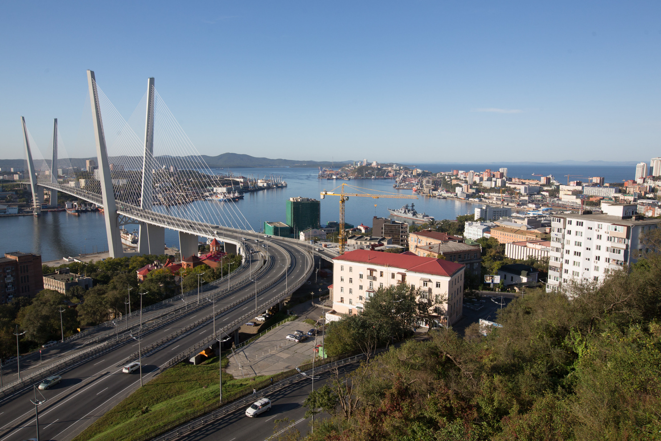 俄罗斯海参崴的金桥和城市高速公路。