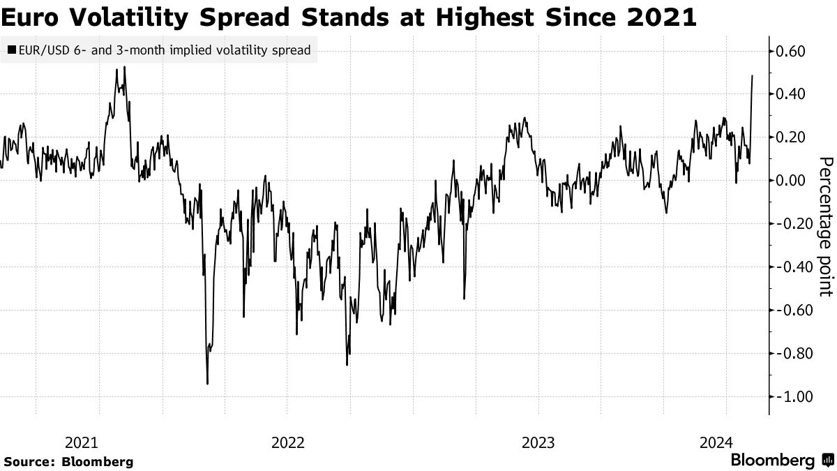 尽管其他地方的紧张情绪并不那么明显,但也在显现。周二,墨西哥比索的六个月和三个月隐含波动率之间的差距为1个百分点,比周五的收盘价几乎增加了四倍,但仍低于2024年的高点。数据显示,欧元的六个月和三个月波动率之间的差距在周二接近0.5个百分点,这是自2021年11月以来的最高水平。
