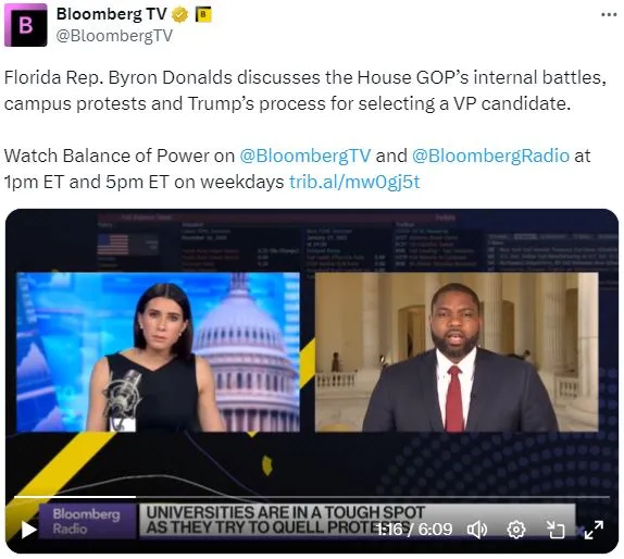 今天在彭博电视台的 权力平衡 早间版中,主持人 Kailey Leinz 采访了共和党代表 Byron Donalds,讨论了众议院共和党的内部斗争、校园抗议以及特朗普选择副总统候选人的过程。