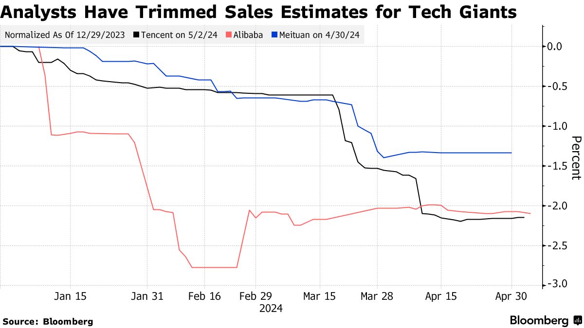 腾讯预计在截至3月的季度中收入增长6%,而阿里巴巴的销售预计增长5.6%,根据彭博社汇编的平均分析师估计。
