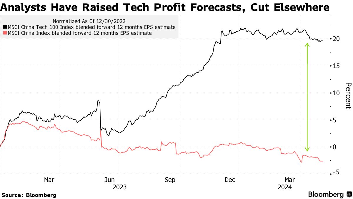 不过,仍然有乐观的空间,因为科技公司是去年提升利润的最佳表现者之一。根据彭博社汇编的数据,MSCI中国100家科技公司的未来收益预期在2023年增长了约20%,尽管其他行业的预测有所下降。