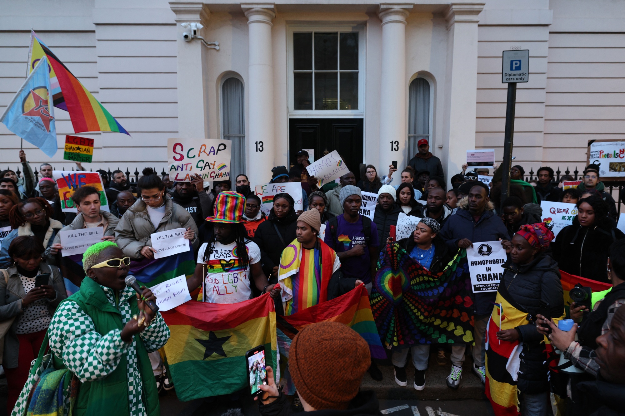 反对加纳反LGBTQ法案的抗议者在3月6日在伦敦的加纳高级专员办事处外示威。