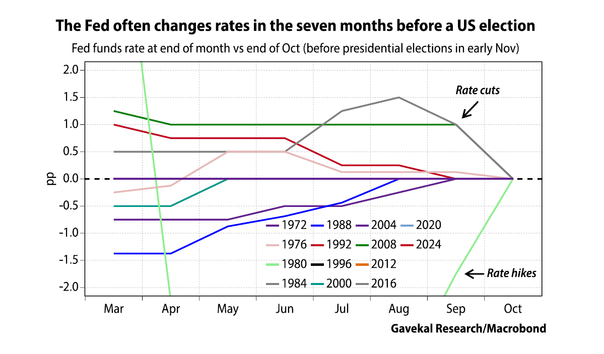根据丹耶尔的说法,中心观点是,去年出现的明显通缩趋势,看起来证明了需要降息,但随后出现了通胀反弹。这张Gavekal Research的图表显示了美联储在以往选举前的政策行动。