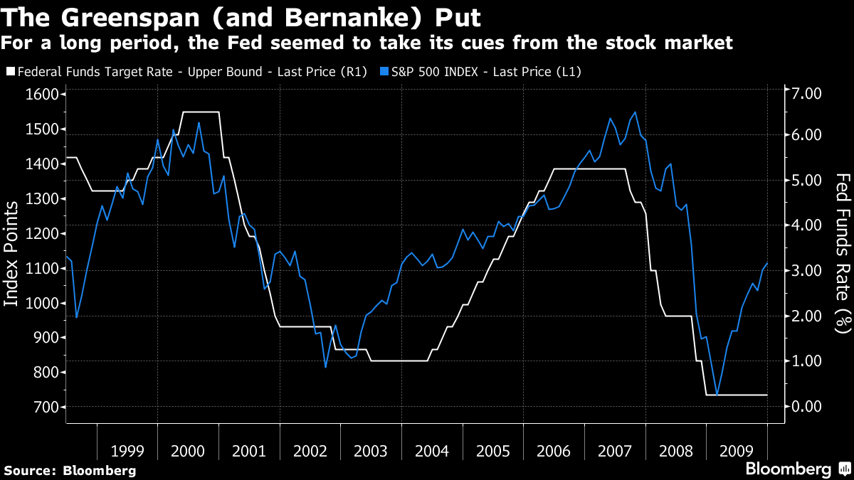 一些分析师将去年十二月的转变解读为一种新的“美联储保护” - 认为鲍威尔在最近的联邦公开市场委员会会议后的最新新闻发布会可能被视为最后的证据。很难解释美联储保护会是什么样子,而不借助更多行话。宏观指南针的阿方索·佩卡蒂埃洛通过总结将其概括为一种情况,即货币政策当局将“支持市场”,投资者会知道一旦出现市场疲软迹象,大规模宽松政策就会出现。但当经济或通货膨胀加速时,美联储不会采取鹰派立场,而是会“让经济保持热度”。最初被称为“格林斯潘保护”,因为在艾伦·格林斯潘担任美联储主席的最后十年里,联邦基金利率似乎在根据股市的涨跌而上下波动: