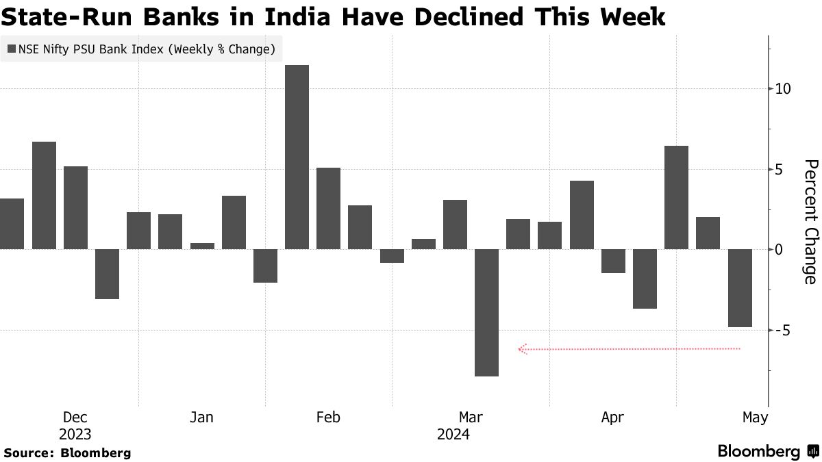 一个 国家银行的 指标,作为大型基础设施项目的主要融资者,本周下跌了4.8%,正朝着近两个月以来最大的下滑方向发展。更广泛的银行业 指数 下滑了1.6%,而基准的Nifty 50指标下跌了0.9%。