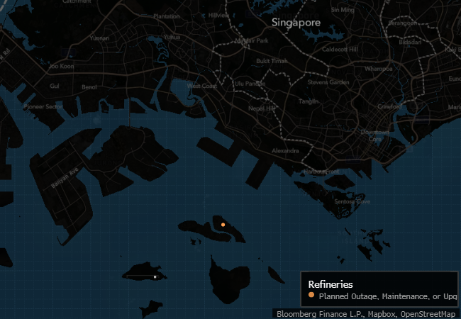 壳牌的布科姆炼油厂位置以橙色显示。壳牌在新加坡的资产包括一个每天能够处理237,000桶石油的炼油厂,一个在裕廊岛上生产单乙二醇的设施,以及一个位于布科姆岛的乙烯工厂。
