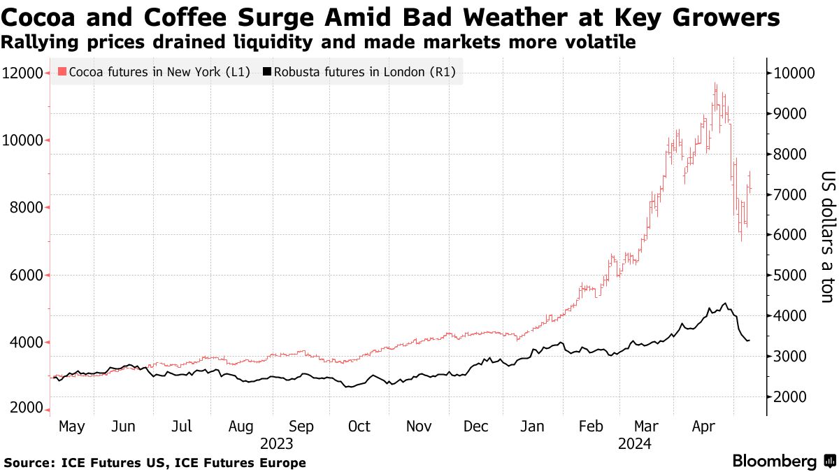 在截至四月的六个月内,罗布斯塔咖啡期货上涨超过70%,达到了四十多年来的最高价格。今年可可价格已经翻倍,上个月创下纪录。