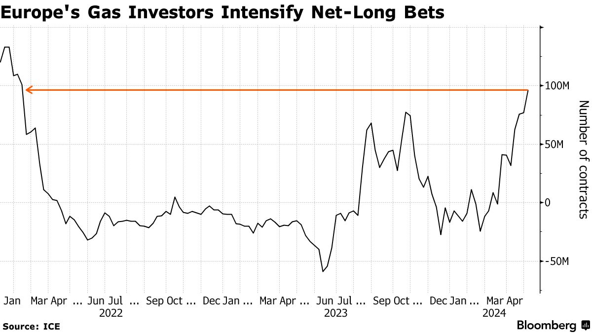资金对欧洲天然气的看涨情绪是自能源危机早期以来最强烈的,尽管夏季已经来临,但这表明对供应紧张的担忧日益加剧。