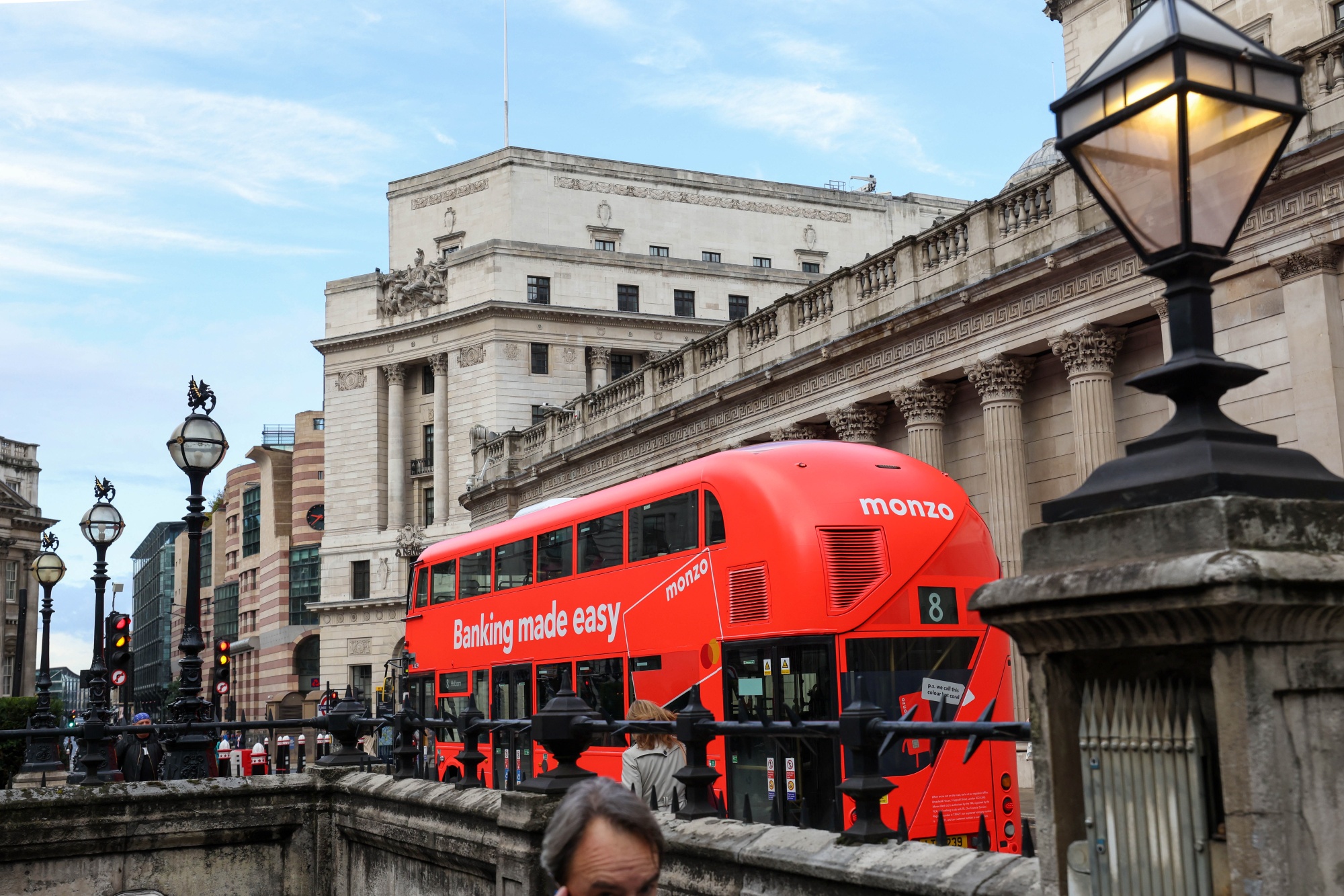 一辆在伦敦市区宣传Monzo银行的公交车。