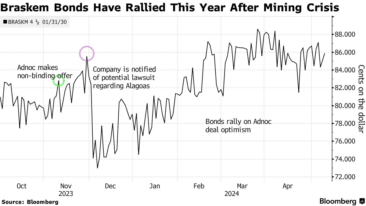 与阿布扎比国家石油公司达成交易的前景以及对更好收益的预期,推动了Braskem债务今年的反弹。巴西母公司Braskem和墨西哥Braskem Idesa SAPI的债券在第一季度中排名拉丁美洲企业中表现前三。