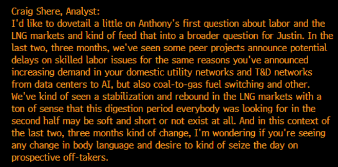 我们最近在乔治亚州看到这一点。我们在杜克和北卡罗来纳州、道明尼亚和弗吉尼亚州也看到了这一点。每一家公用事业公司都在说‘鉴于我们看到的进入系统的所有需求,我们必须在电网中增加更多的化石燃料资源。这是我们在现有时间范围内能够管理的唯一方法。’现在,对于这是否真实存在很多争论,但这就是正在发生的事情…