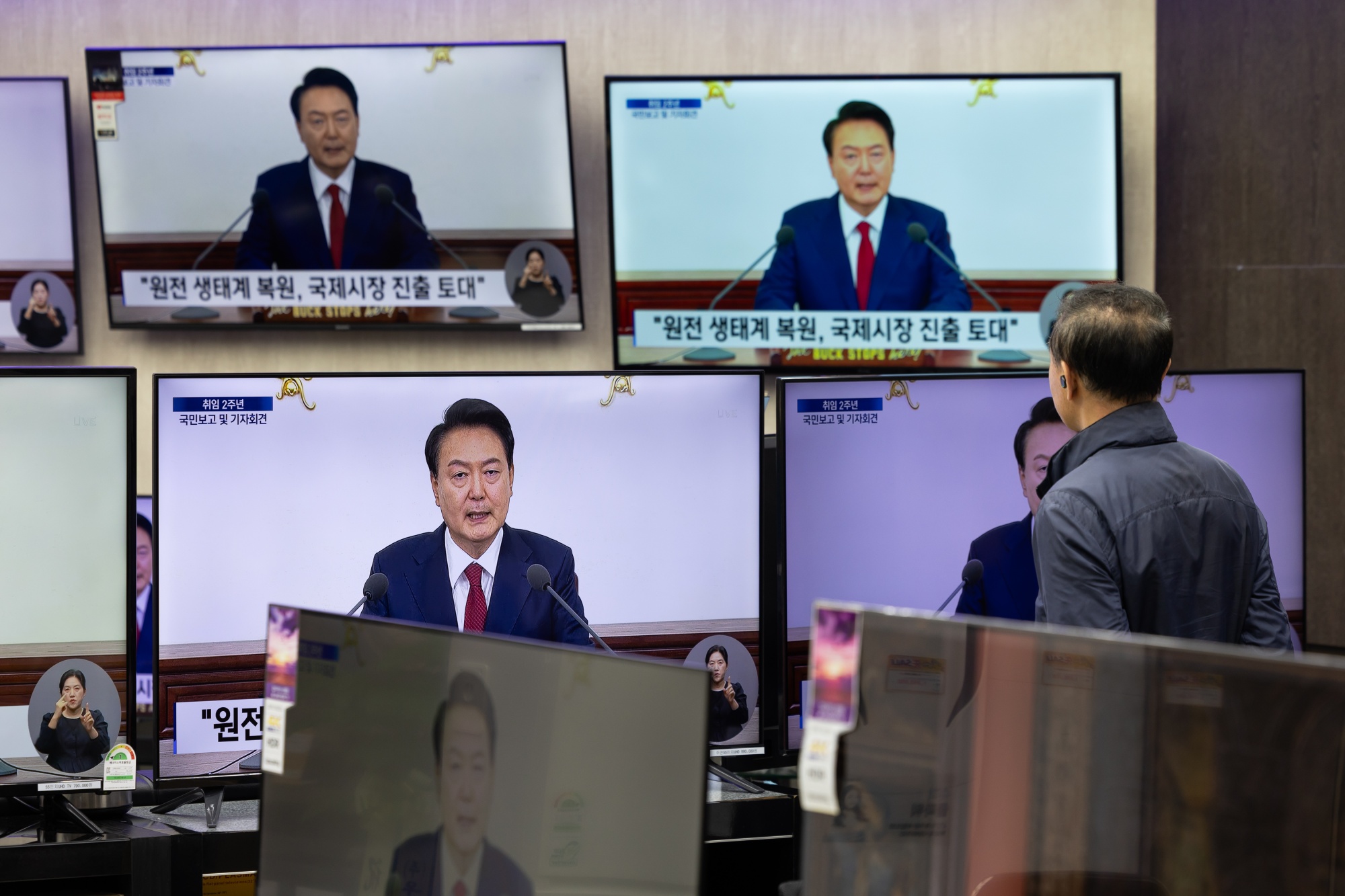 尹锡悦总统新闻发布会的现场直播在首尔的一家电子商店的电视屏幕上播放。摄影师:SeongJoon Cho/Bloomberg在上个月的选举中,反对派联盟由进步的民主党领导,增加了在议会中的多数席位,导致总统在其单一五年任期的剩余时间内几乎没有回旋余地。