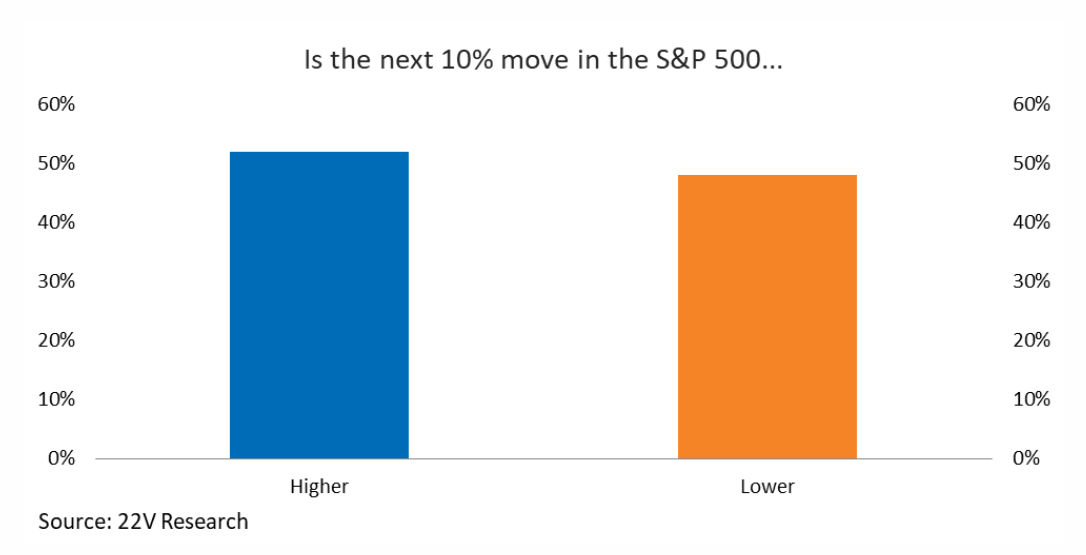 22V Research进行的一项调查显示,投资者对标普500指数的下一个10%的走势几乎意见分歧——52%的人认为基准指数将上涨,48%的人认为将下跌。