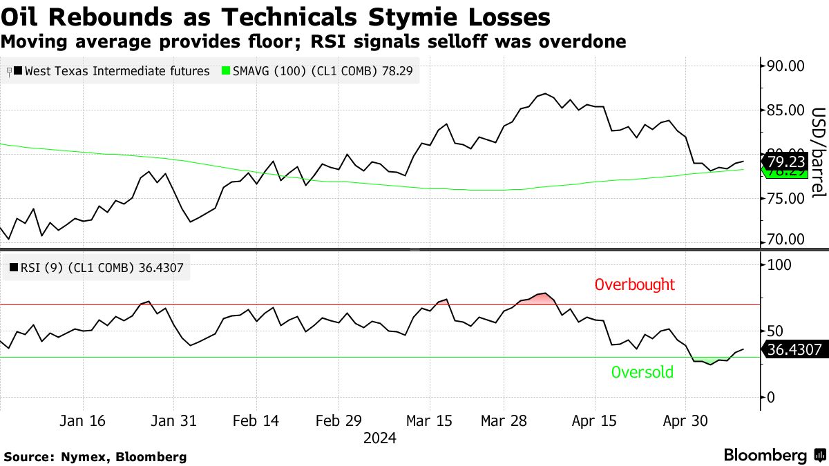 西德克萨斯中质油上涨0.3%,收于每桶79美元以上,此前经历了一个月的下滑,使价格降至自3月中旬以来的最低水平。100日移动平均线遏制了原油的损失,而九日相对强弱指数则表明抛售过度。支撑技术反弹的是一份报告显示美国库存上周减少了136万桶。