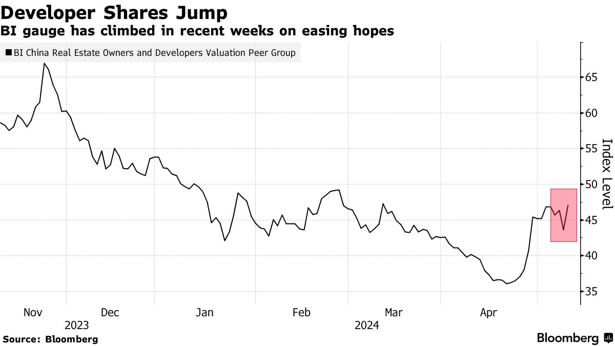 彭博情报对中国开发商股票的评估周四上涨了5.5%。自四月中旬以来,因对进一步放松的期望,该指数已上涨28%。