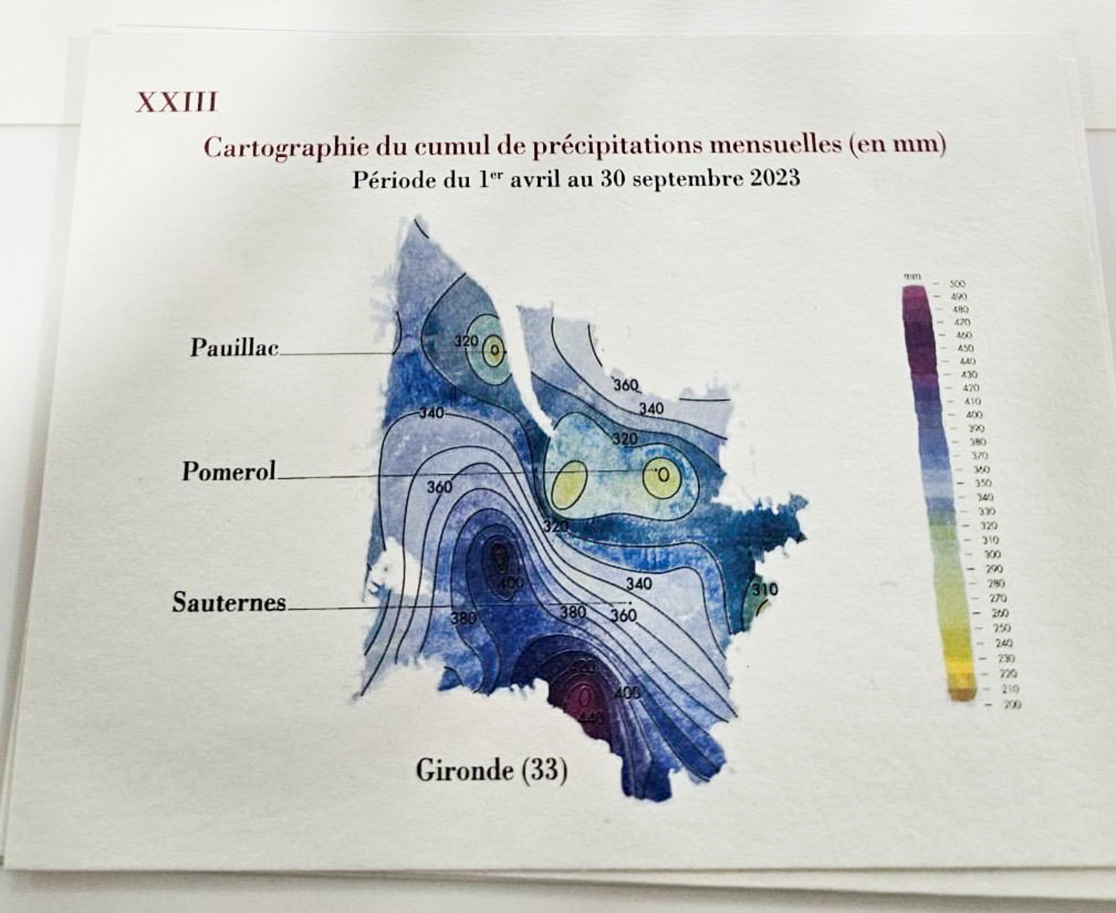 这张拉菲罗斯柴尔德地图显示了降雨模式。摄影师:埃林·麦考伊/彭博社生长季节并不容易,面临着过量降雨和昼夜温暖气温的致命组合——与2022年严重干旱和高温的情况截然不同。酿酒师们在应对天气的突然变化时苦苦挣扎,天气预报常常误导。成功归结于运气、微气候、土壤类型、葡萄品种和人类决策。经验和资源(意味着专业知识和资金)是最终的决定性因素。对于那些做出错误判断的人来说,灾难潜伏在身边。