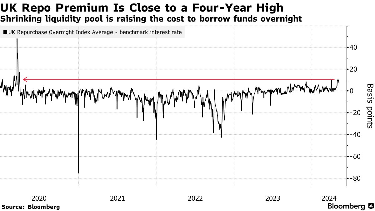 投资者在回购市场上获得现金所支付的银行利率溢价——以回购隔夜指数平均值(RONIA)衡量——在本月初达到了四年来的最高点,经过季度末的波动调整后。尽管仍远低于2020年疫情后现金争夺的激增,但这又是流动性需求加剧的另一个迹象。