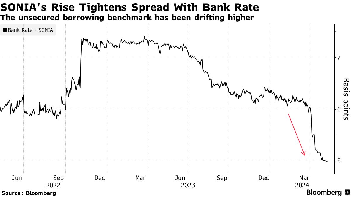 SONIA,作为无担保贷款的英镑基准利率,正在逐渐上升。这使得它与英格兰银行的关键利率之间的利差首次收窄至不到五个基点。尽管近期的变动很小,但流动性状况可能会“逐渐,然后突然”恶化,巴克莱的利率策略师Moyeen Islam在给客户的报告中写道。