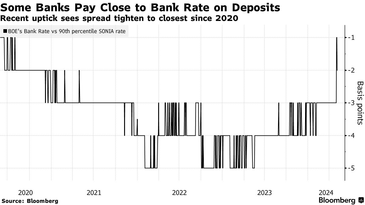 银行必须提供的吸引隔夜存款的利率相对于英格兰银行的关键利率已升至2021年以来的最高水平,彭博社汇编的数据表明。英国中央银行还与欧洲中央银行和美联储存在分歧,后者目前避免直接销售,这突显了政策制定者在逐步减少银行紧急刺激时面临的微妙任务。