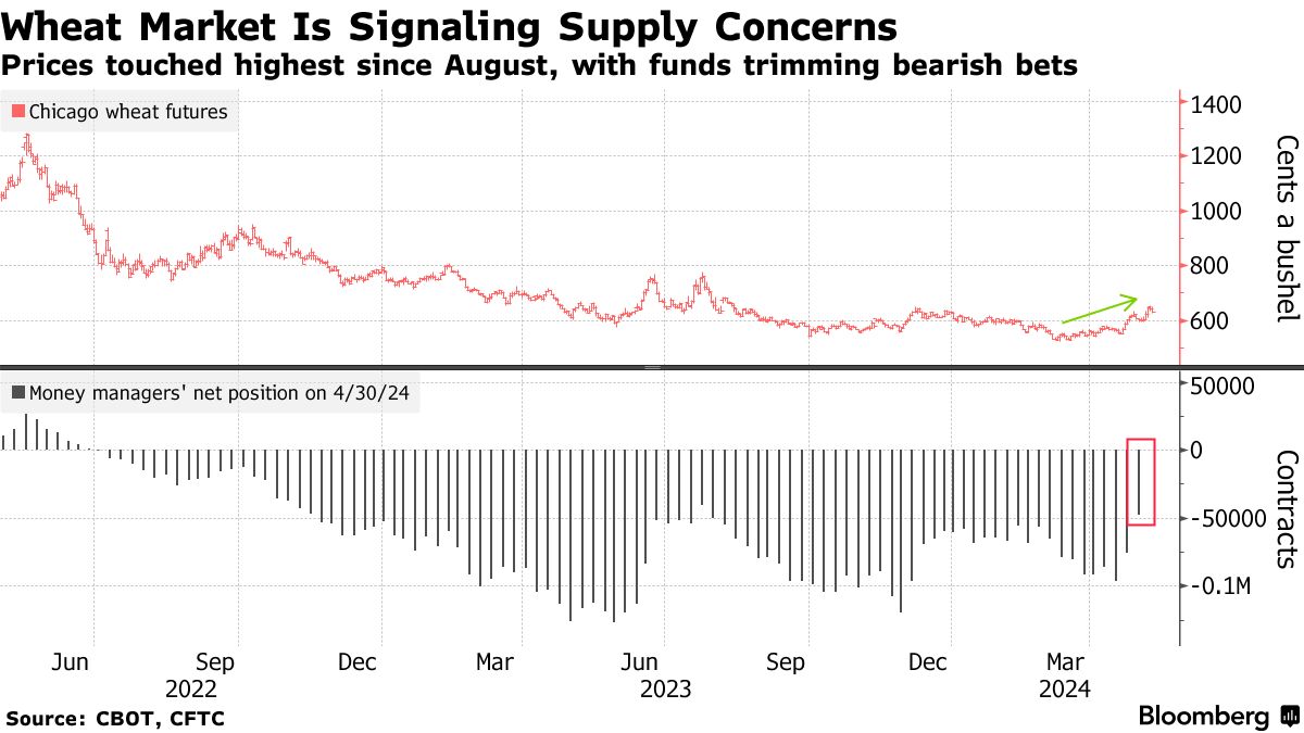 黑海的丰收长期以来抑制了价格,小麦的交易价格仅为2022年创下纪录的一半,但供应担忧再次加剧。期货价格反弹,达到自八月以来的最高点,基金正在削减他们持有近两年的看跌押注。