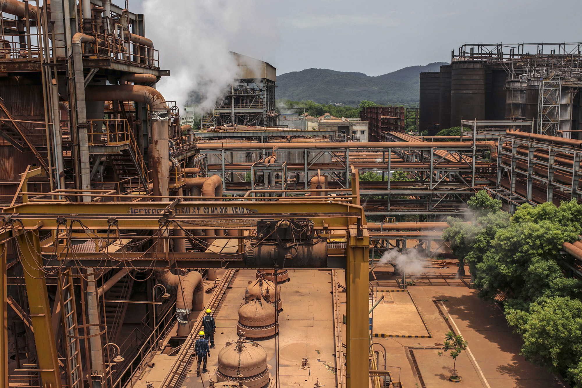 工人在印度奥里萨邦兰吉卡尔区的Vedanta有限公司铝土矿精炼厂的消化单元屋顶上劳动。摄影师:Dhiraj Singh/Bloomberg