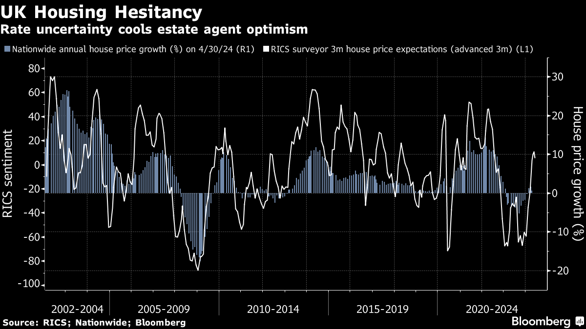 下面是我在RICS调查发布时通常会提到的图表。它显示了未来三个月的价格预期(就方向而言,而非幅度)与实际价格的走势方向相当一致(预期用白线表示,而灰色条形图显示了Nationwide的年度房价增长数据)。