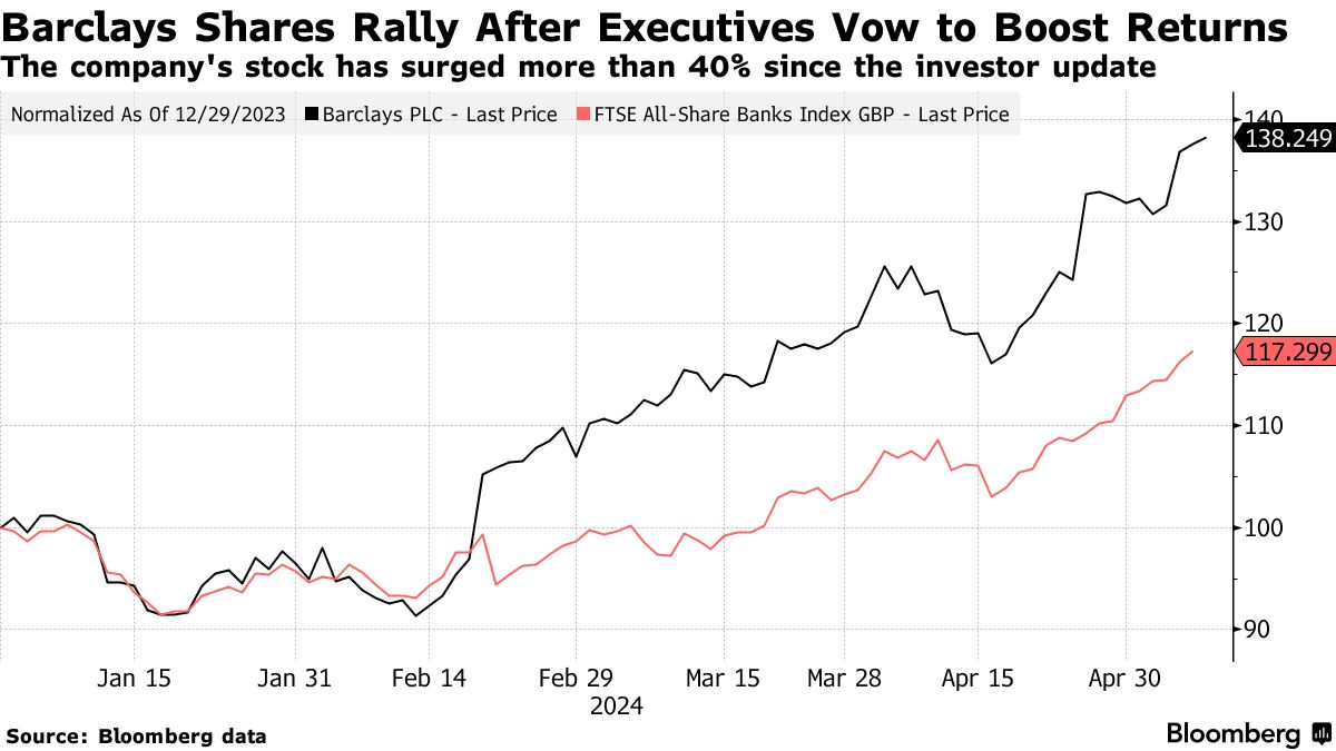 自从高管们在2月份的投资者更新会上公布这一战略以来,巴克莱的股价已上涨超过40%,成为今年迄今为止英国表现最佳的银行股票之一。