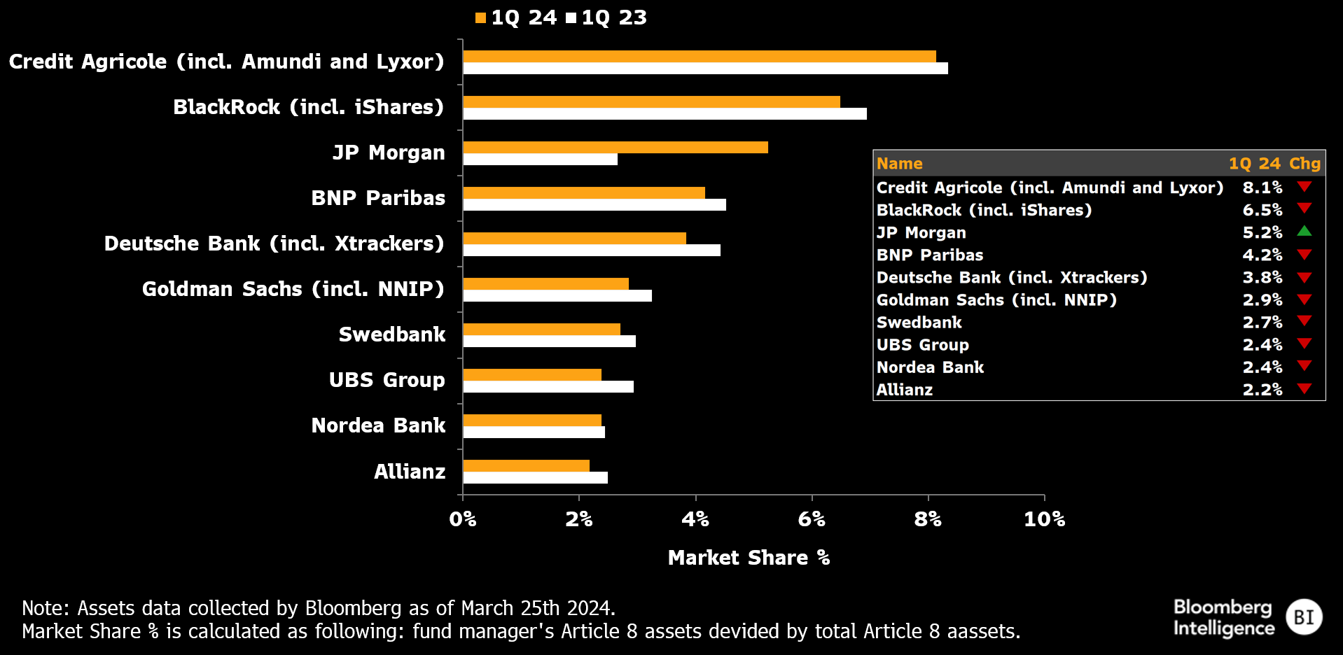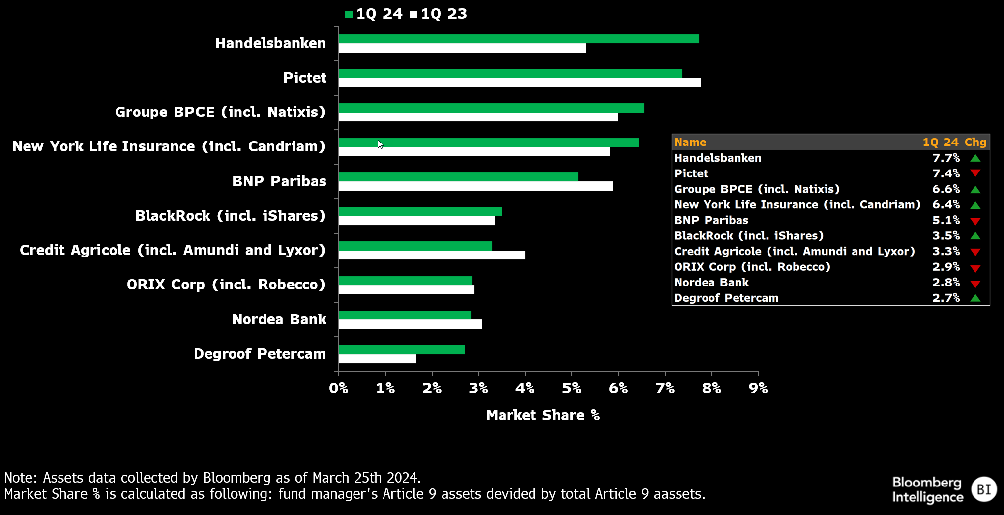SFDR基金 | 欧洲可能继续主导深绿色基金,Handelsbanken、Pictet和BPCE持有超过20%的SFDR第9条资产,此前法国农业信贷在过去12个月内将超过10只基金降级为较浅绿色的第8条基金。(彭博智能)