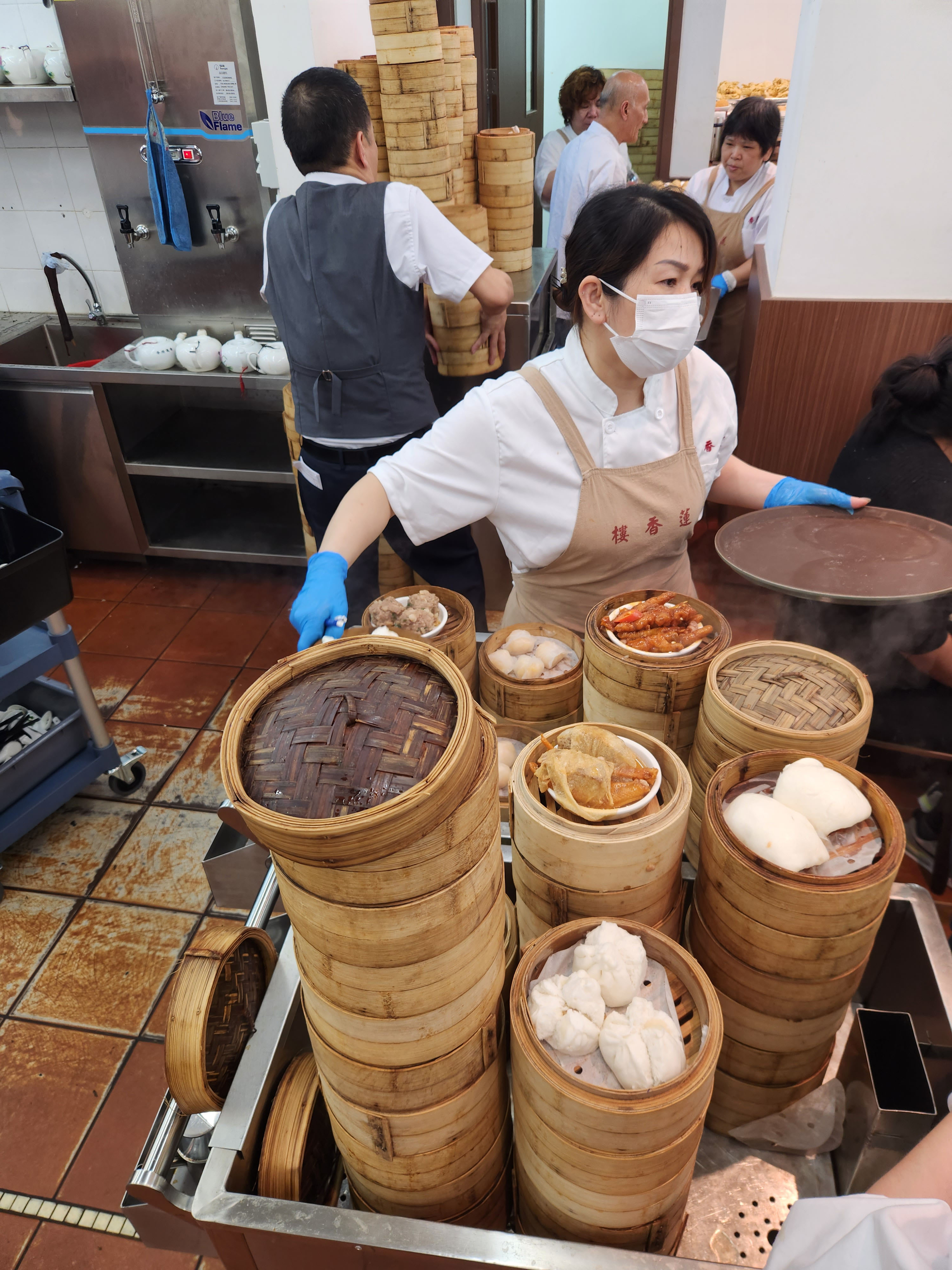 我们会再次点的: 这里的“点心”是指我们希望能尝到的美食。我们在主推车前轮流排队,品尝了菜单上的大部分菜品。叉烧包(蒸烧肉包)外皮松软,内里甜咸适中。烧卖(虾肉和猪肉饺子)口感浓密,哈高里的虾肉鲜嫩多汁。春卷也受到我们小组的喜爱,豆腐皮包裹的肉馅口感宜人。带有新鲜姜片的松软牛肉球非常好吃。所有菜品都配有无尽的铁观音茶。