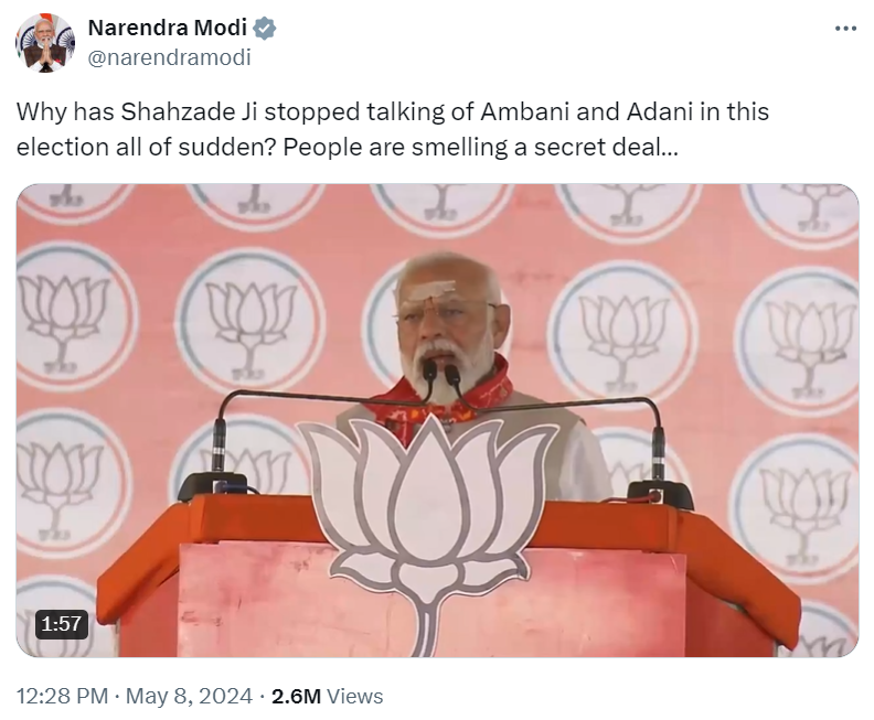 莫迪总理在特伦甘纳的选举集会上。来源:X在投票中期,将印度两大商业集团变成选举炮灰,表明对选举结果的不确定性正在上升。