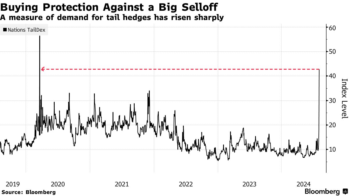 从纽约到伦敦和东京,股票遭受重创。正当市场开始庆祝美联储关于首次降息的信号时,却遭遇了一场完美风暴——疲弱的经济数据、令人失望的企业盈利、过度的市场定位和糟糕的季节性趋势。尽管S&P 500削减了一些损失,但在强劲的交易量中遭遇了近两年来最大的下跌。以科技股为主的纳斯达克100经历了自2008年以来最糟糕的月初表现。华尔街的“恐惧指标”——VIX——一度记录下自1990年以来的最大涨幅。