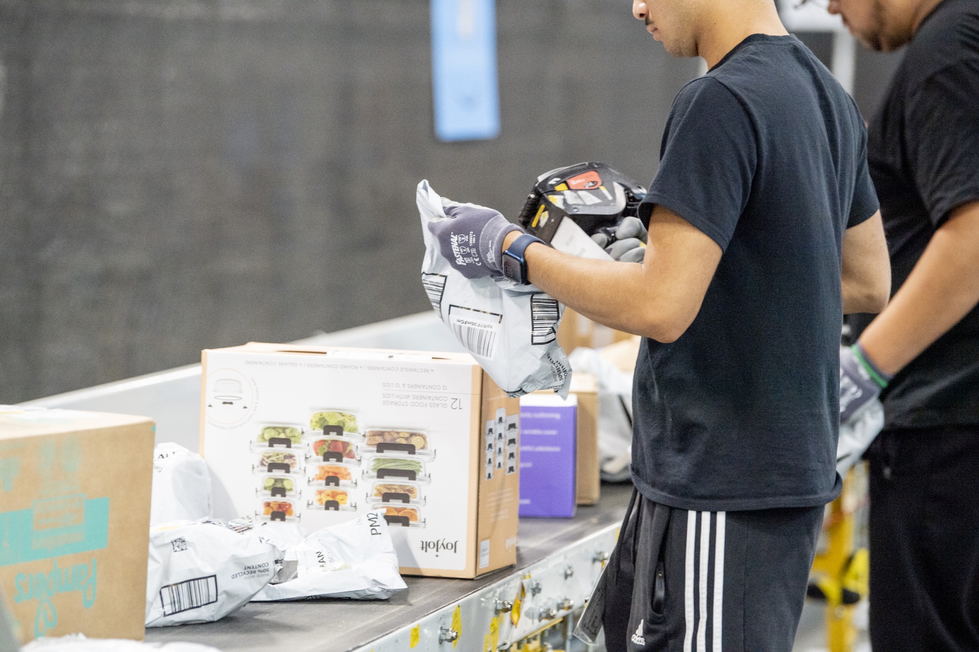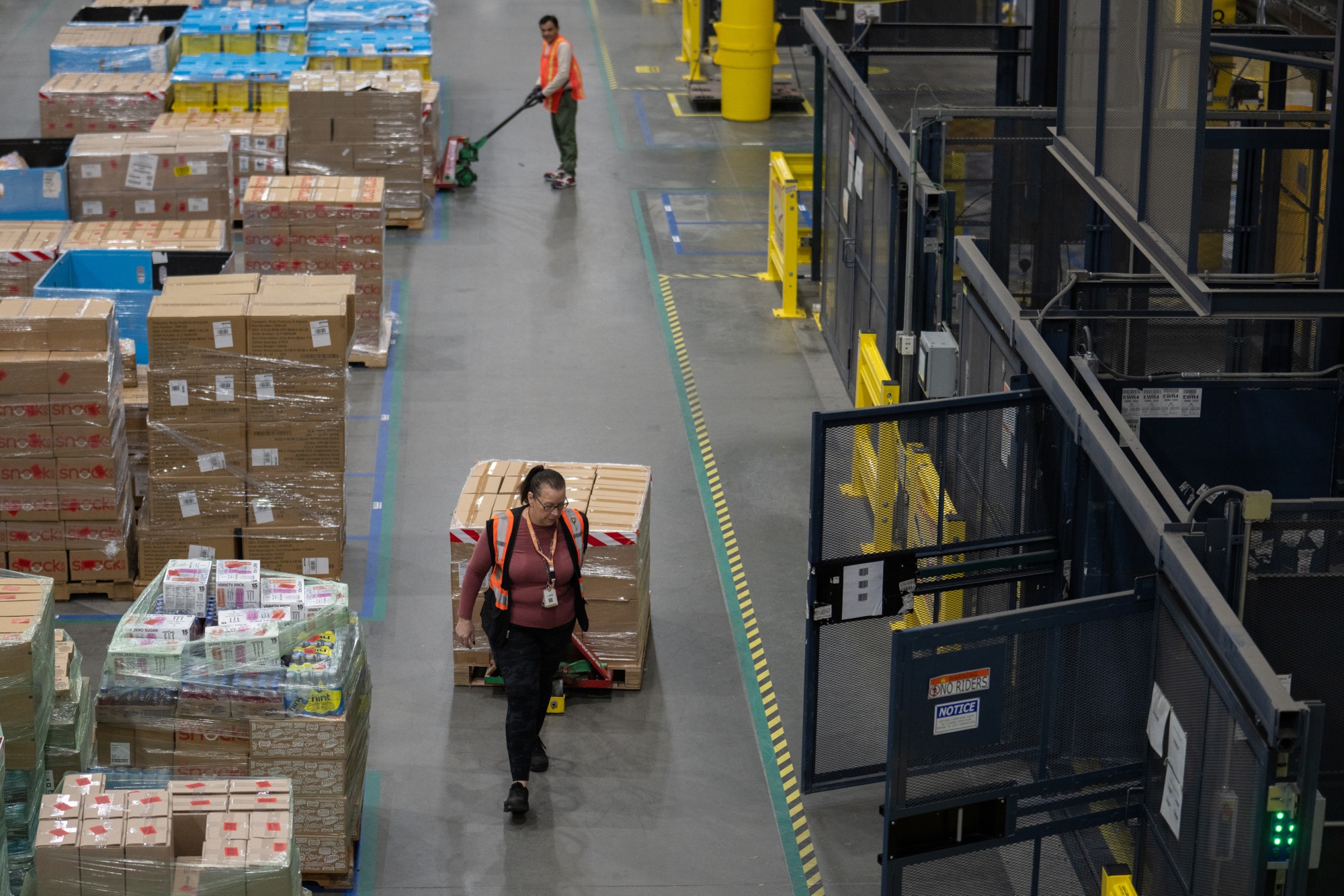 工人在纽约梅尔维尔的亚马逊配送中心履行订单。