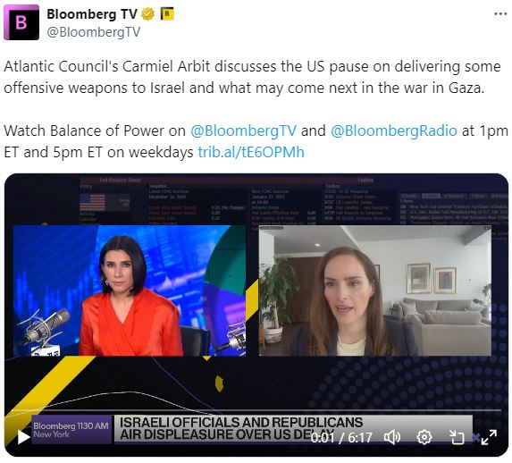 今天在彭博电视台的 权力平衡 上午版1点播出,主持人乔·马修和凯莉·莱因兹采访了大西洋理事会的卡米尔·阿比特,讨论美国暂停向以色列交付某些攻击性武器的情况,以及加沙战争接下来可能发生的事情。