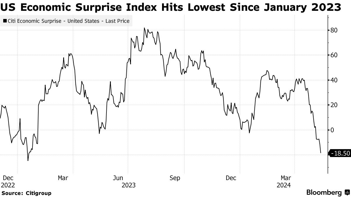 一系列低于预期的数据点——从就业到服务和制造业——使得美国版的花旗集团经济意外指数降至2023年1月以来的最低水平。该指标衡量实际发布与分析师预期之间的差异。
