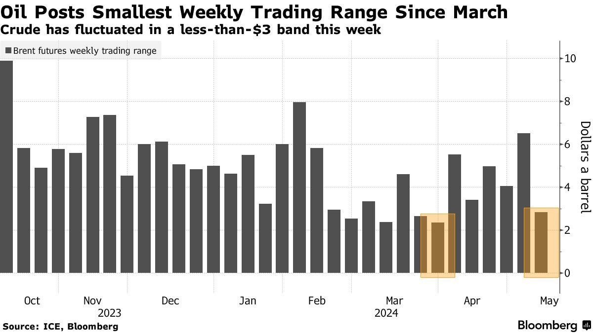原油最新的涨幅掩盖了相对温和的价格波动,期货记录了自三月以来最小的周交易区间。价格已经削减了中东紧张局势带来的大部分溢价,焦点转向某些类型原油的明显过剩。