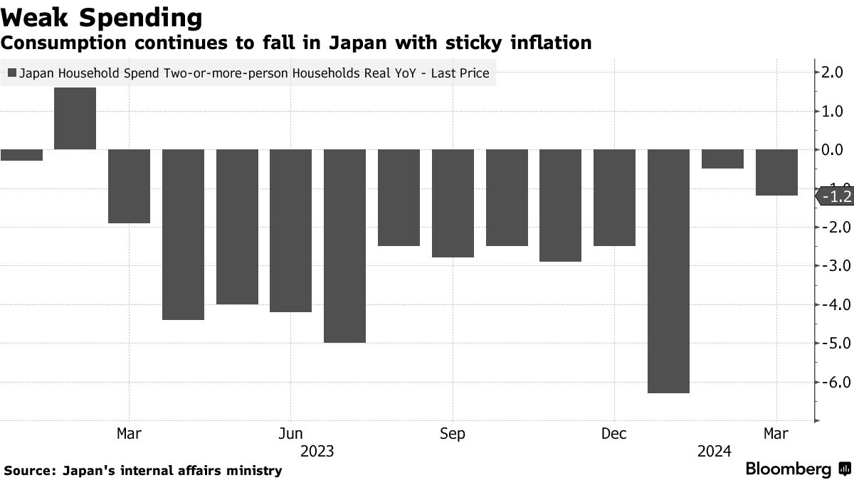 3月份的同比下降表明,家庭继续收紧预算,因为工资 增长未能跟上生活成本的上升。3月份实际工资连续第24个月下降,此期间消费者通胀的一个关键指标持续保持在日本银行2%的通胀目标之上。