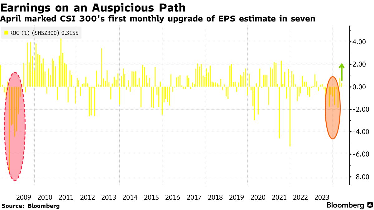 根据彭博社汇编的数据,分析师在四月份首次上调了CSI 300指数成分股的每股收益预测,这是七个月以来的首次。到三月份的六个月下降趋势是自2008-09年全球金融危机以来最长的。
