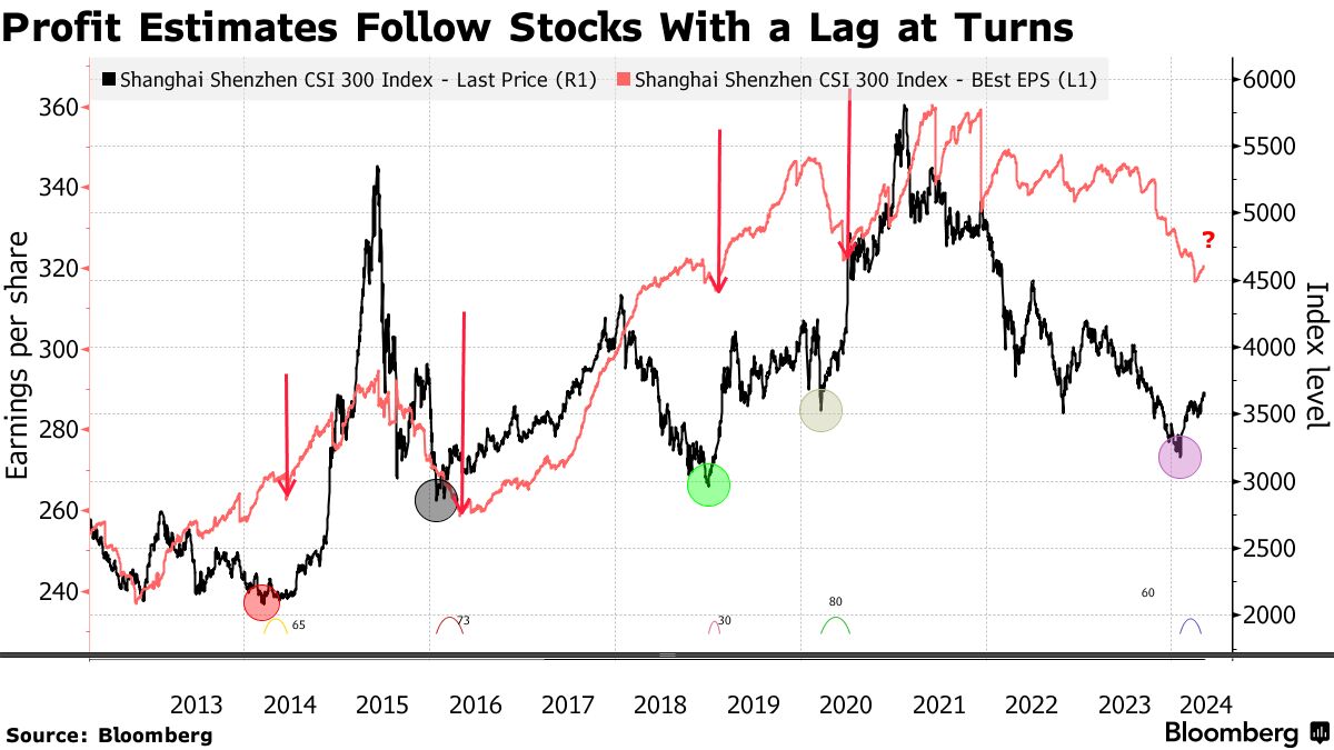 彭博社的数据表明,CSI 300指数在2014年、2016年、2018年和2020年的前低都在接下来的三个月内伴随着收益预期的整体增加。