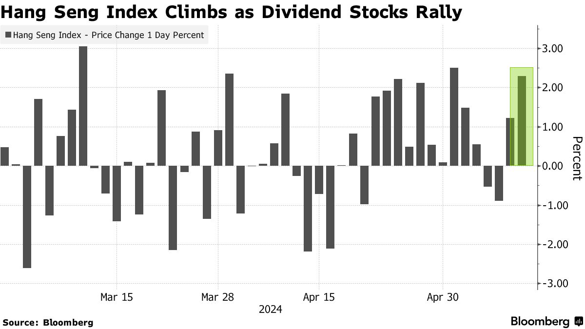 恒生指数在周五上涨了2.3%,其中一些最大的涨幅来自于相对高股息收益率的股票,如香港交易及结算所有限公司和中国建设银行股份有限公司。彭博社对中国房地产股票的衡量指标上涨了11%。