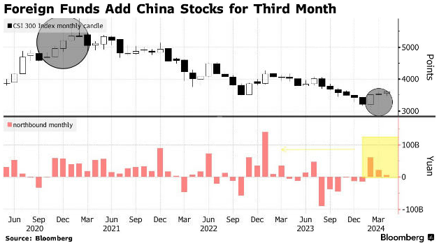 有证据支持这一观点。外国资金在四月份连续第三个月增加了对中国股票的持有——这是大约一年来最长的连续增长,而瑞银表示全球基金在股票上的低配可能已经触底,因为资金流入恢复。