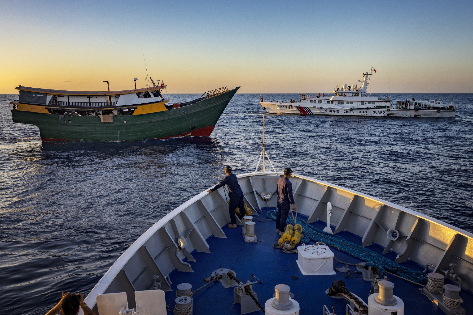 一艘菲律宾船只在南海被中国海警船阻挡。