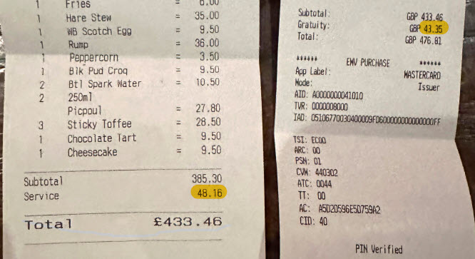 在12.5%的服务费48.16英镑之后,刷卡机提示顾客再加10%或更多。结果:小费总计91.51英镑——这在曼哈顿也不算过分。拥有Jugged Hare的ETM集团未对此发表评论。