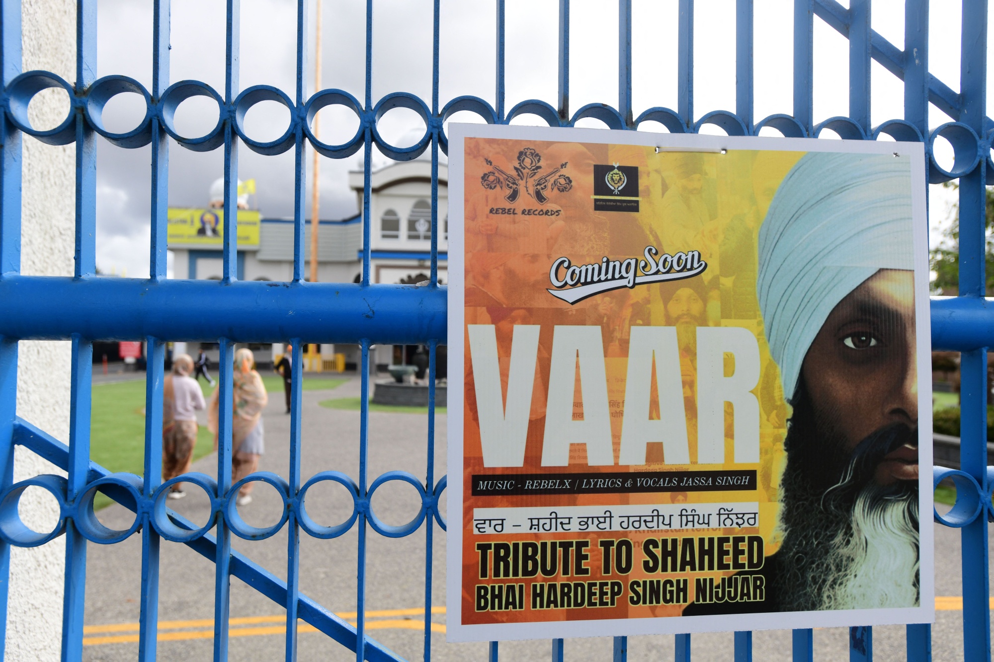 一张在加拿大不列颠哥伦比亚省萨里市的古鲁纳纳克锡克教寺庙展示的哈迪普·辛格·尼贾尔致敬海报,时间为2023年9月。