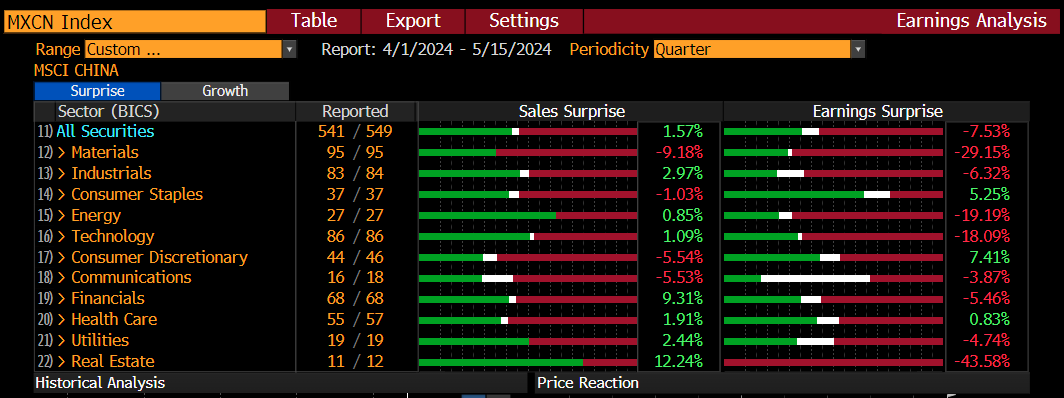 自4月1日以来,MSCI中国指数成分股的整体收益已落后于预期近8%。来源:彭博社根据彭博社汇编的数据,自4月1日以来,MSCI中国指数上的公司整体收益已落后于预期近8%。