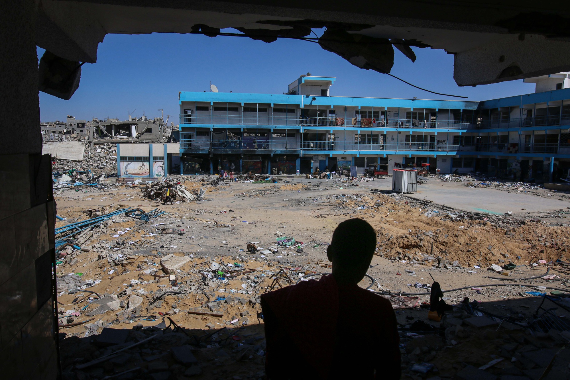 在加沙哈农尤尼斯中心的一所联合国救济和工程署(UNRWA)学校的废墟中,流离失所的巴勒斯坦人,拍摄于5月7日。