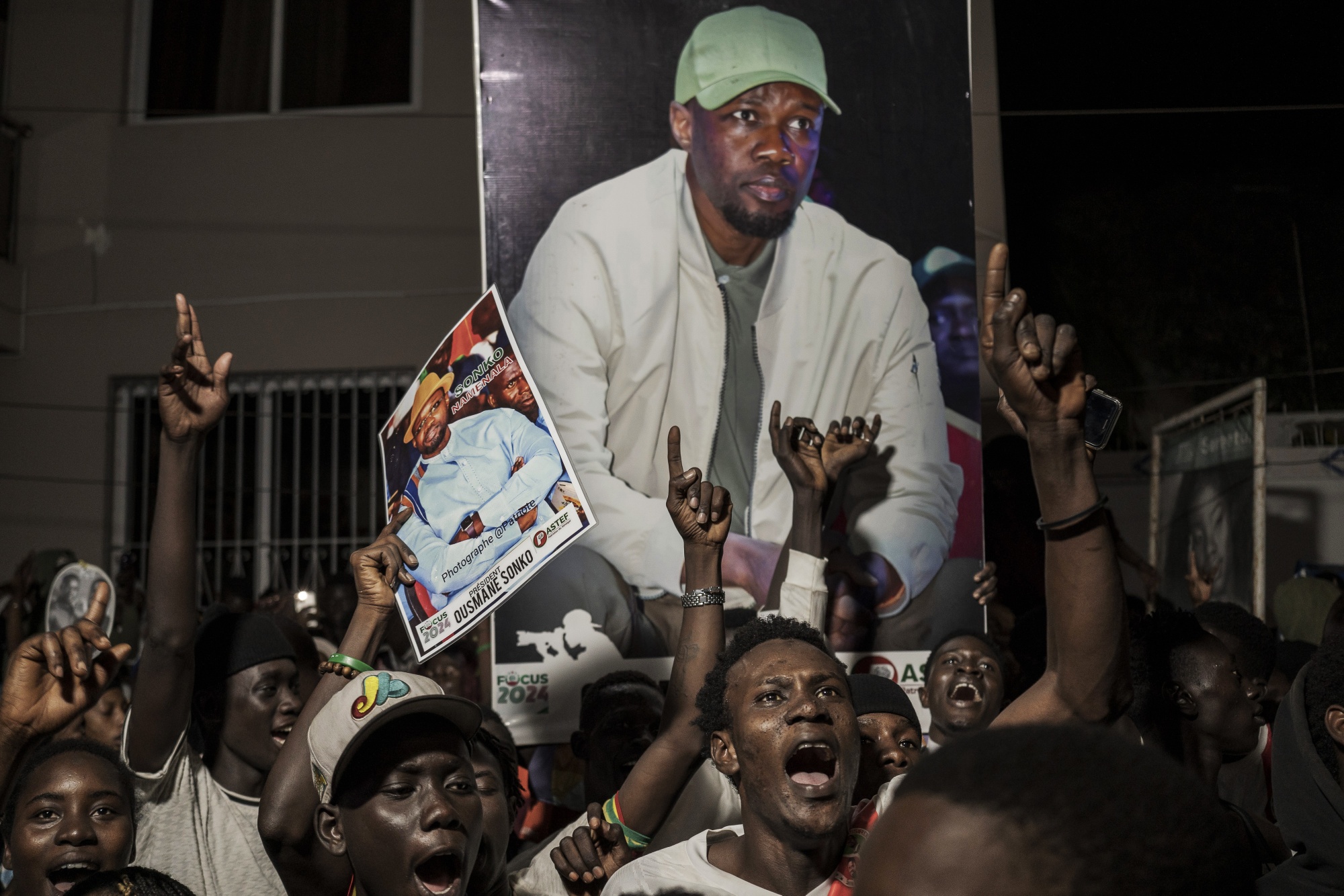 在三月的法耶集会上,支持者们举着乌斯曼·松科的海报。摄影师:安妮卡·哈默施拉格/彭博社那时,反对派候选人和法耶的导师乌斯曼·松科因诽谤定罪被取消了参选资格。在投票前的三年里,松科积累了大量指控——包括传播假新闻——这引发了全国范围的抗议运动,并巩固了他作为萨尔最强烈对手的地位。随着他的受欢迎程度上升,他在2014年创立的政党Pastef的支持度也随之上升,该党在对缺乏就业和机会感到沮丧的年轻塞内加尔人中获得了追随者。