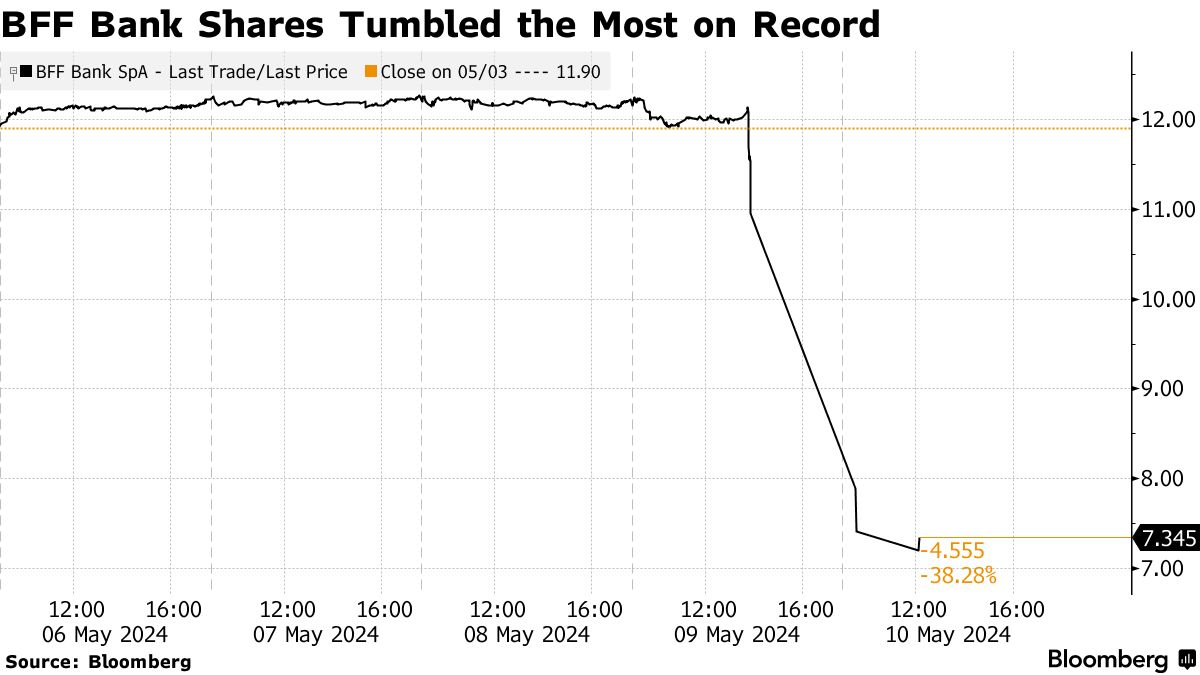 BFF在发布其第一季度业绩时披露了意大利银行的调查结果,导致股价暴跌,市值缩水超过三分之一,降至23亿欧元(25亿美元)。在周四下跌10%后,周五股价暴跌最多达36%。