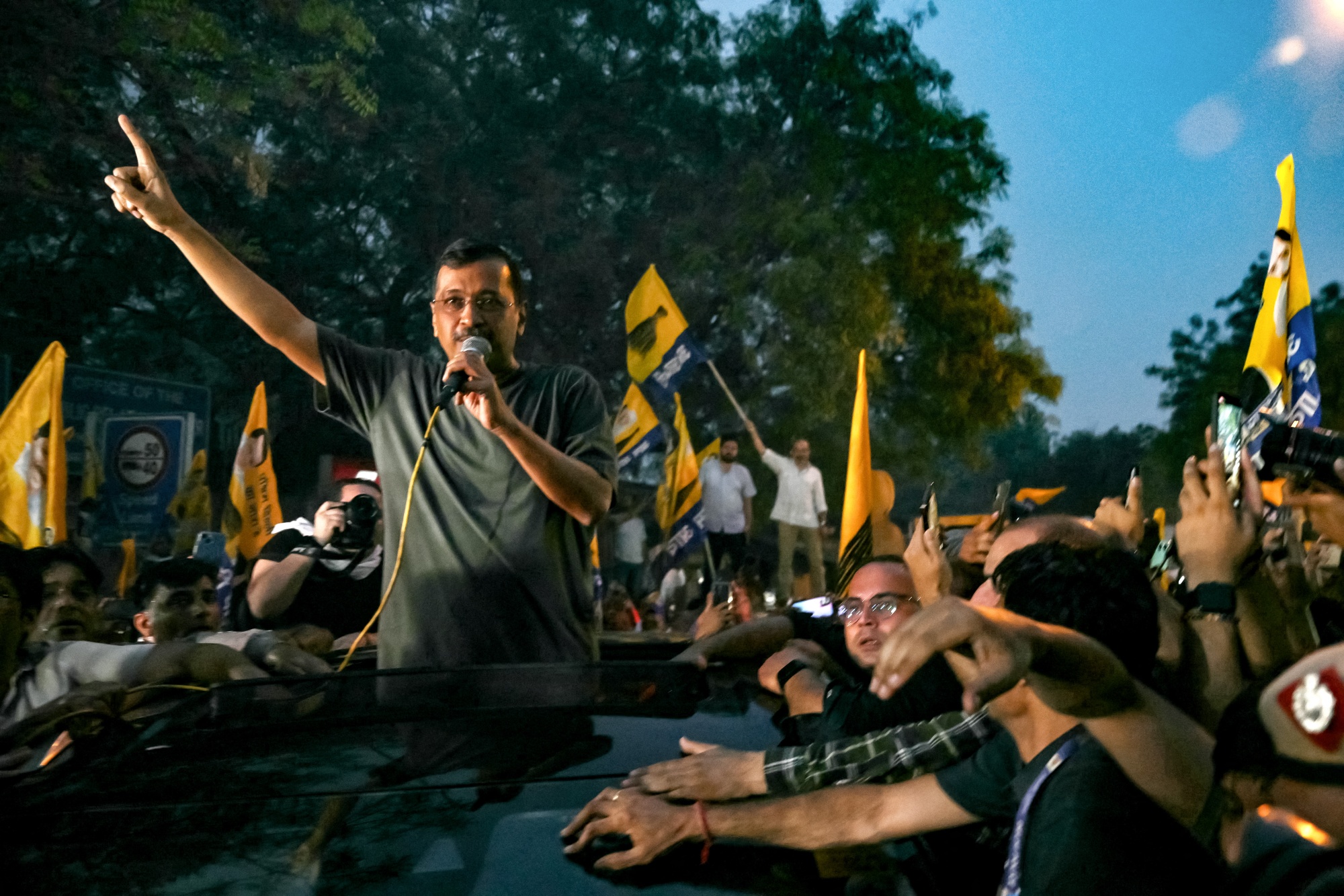 阿尔温德·凯杰里瓦尔在5月10日从新德里的监狱释放后向他的支持者和党成员发表讲话。摄影师:阿伦·桑卡尔/法新社/盖蒂图片社