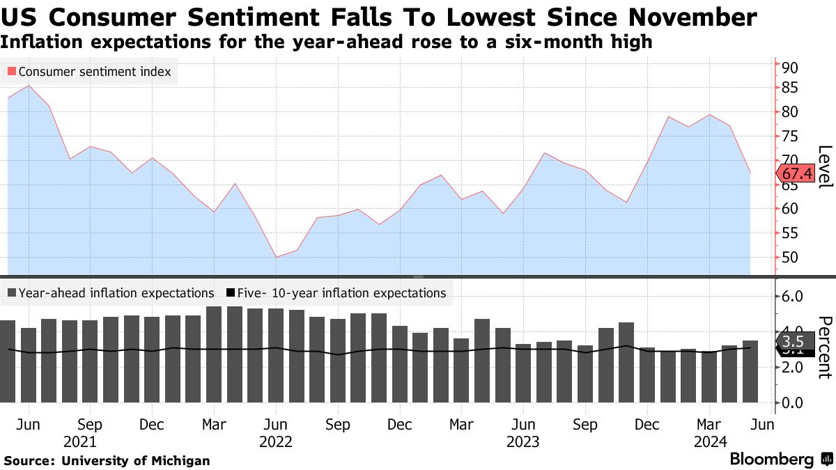 根据密歇根大学的初步数据显示,信心指数在5月从77.2滑落至67.4。该数字低于彭博社对经济学家的所有预测。